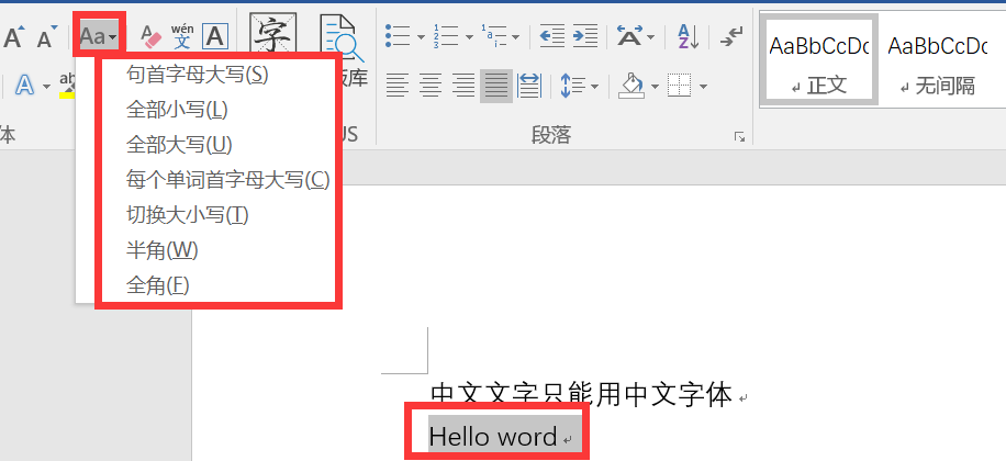 中文文字只能用中文字体,英文文字无论任何字体都可以使用,字号默认最大是72,可以设置更大的,在框里输入就可以,Ctrl+右中括号键可以放大,Ctrl+左中括号键可以缩小,英文字母大小写切换点击如下图: