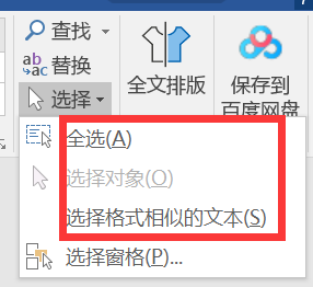 全选就是Ctrl+a,选择对象,对象就是指图片、形状,点击选择窗格,右侧出来了选择(全部显示和全部隐藏),此时插入一个图片,在右侧就能看到该图片,选择格式相似的文本就是把格式一样的文本选择出来