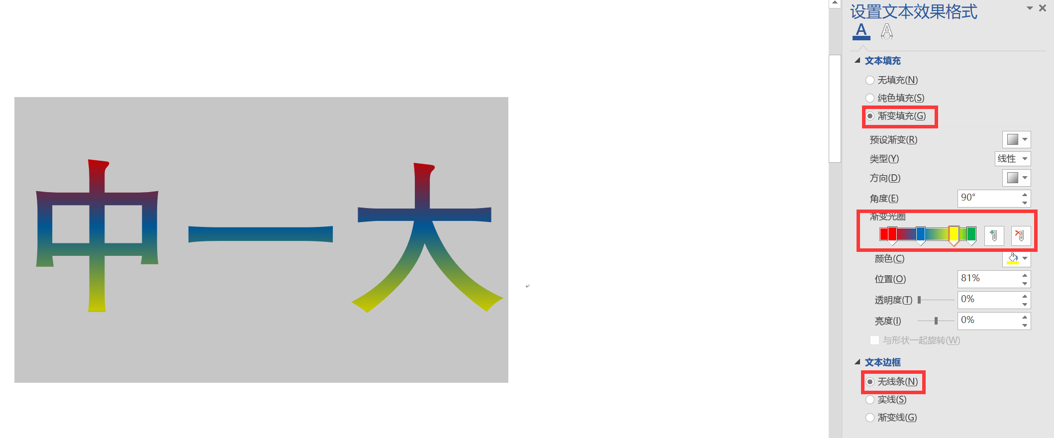 选中文本,文本填充选择渐变填充,文本边框选择无线条,如下图: