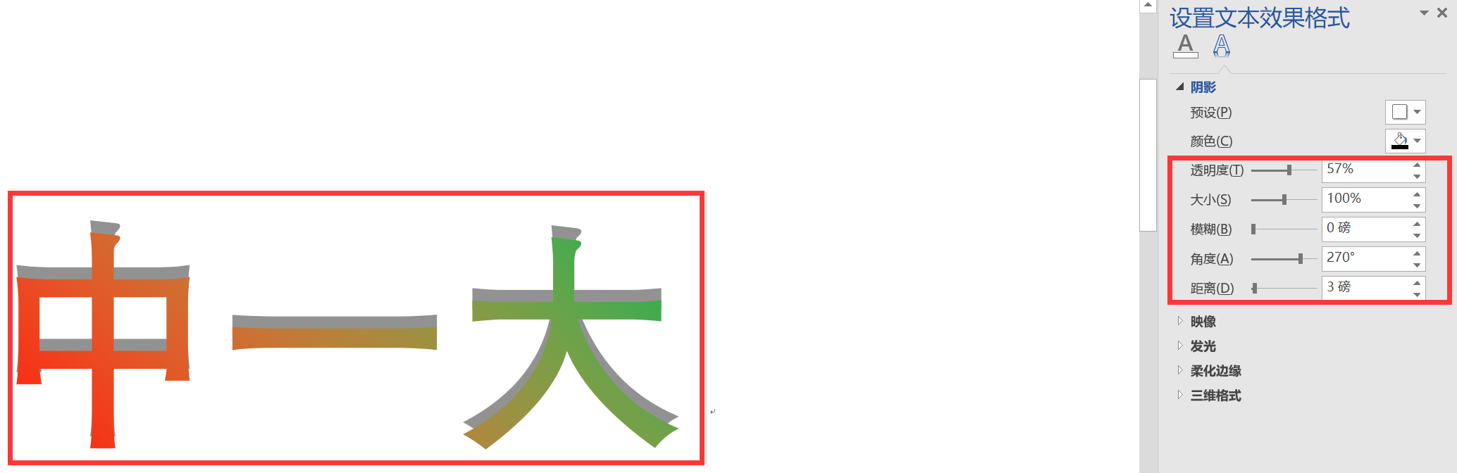 点击文本效果和版式->阴影,弹出设置文本效果格式,可以修改阴影下的所有字段,如下图: