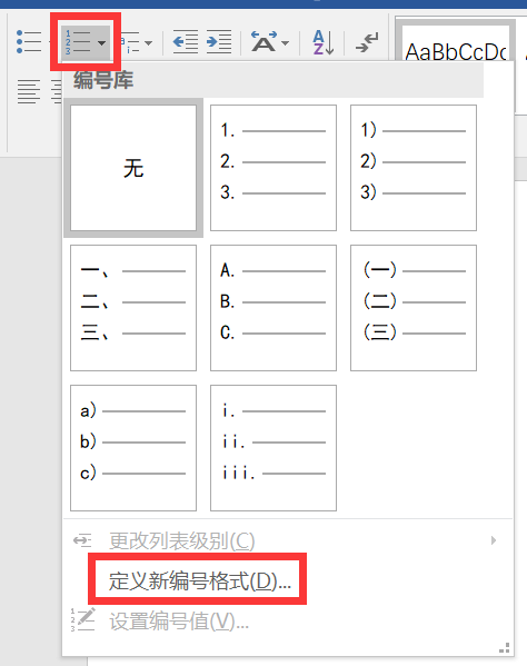 编号样式下拉框里有多个值,选择一个,点击确定按钮,会出现一个编号一,输入内容,点击回车,就出现编号二......,如果还想在一下面在输入内容,回车的时候会出现二,点击编号->更改列表级别,选择a),输入内容,如果不想要这种格式的,点击编号->更改列表级别,弹出如下图: