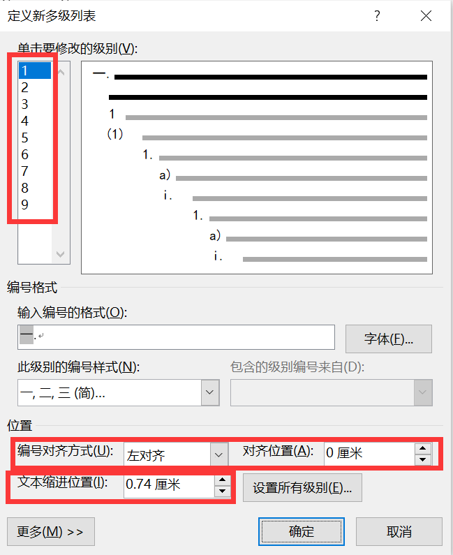可以对多个级别进行设置编号对齐方式、对齐位置和文本缩进位置等,也可以按照预设里面的来设置,一般不用预设里的来,点击编号->设置编号值,弹出起始编号弹窗,如下图: