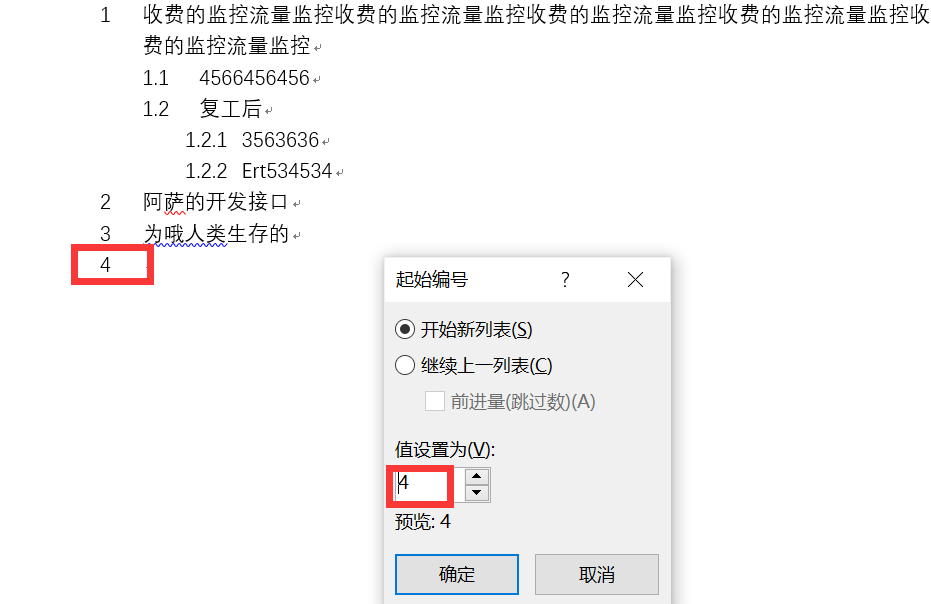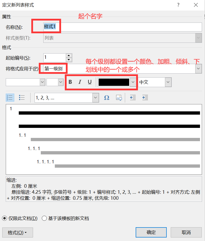 如果把值设置为从4改成1,点击确定又从1开始了,点击多级列表->定义新的列表样式,弹出定义新列表样式弹窗,如下图: