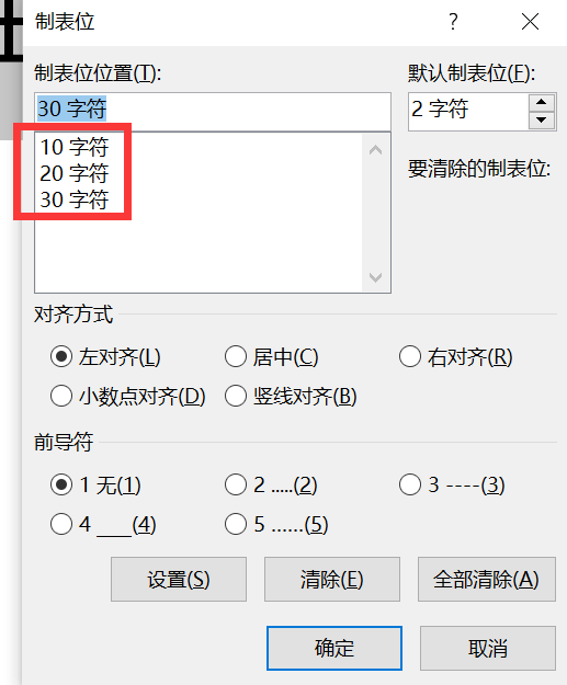 在制表位位置输入10,点击一下设置按钮,显示10字符,可以多设置几个,比如输入20、30,点击设置出现如下图: