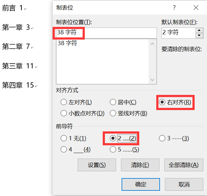 制作一个目录,全部选中,点击全部清除,保证所有页码在第38列右对齐,前导符输入......,如下图: