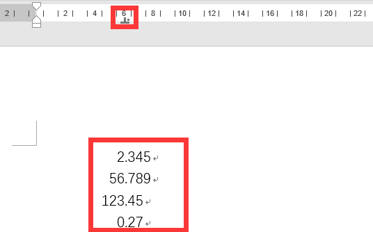 选中这四个数字,制表位里点击全部清除,制表位位置输入6,点击设置,对齐方式选择小数点对齐,点击确定按钮,把光标分别放在每个数字的前面,点击Tab键,小数点全部对齐了,如下图: