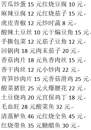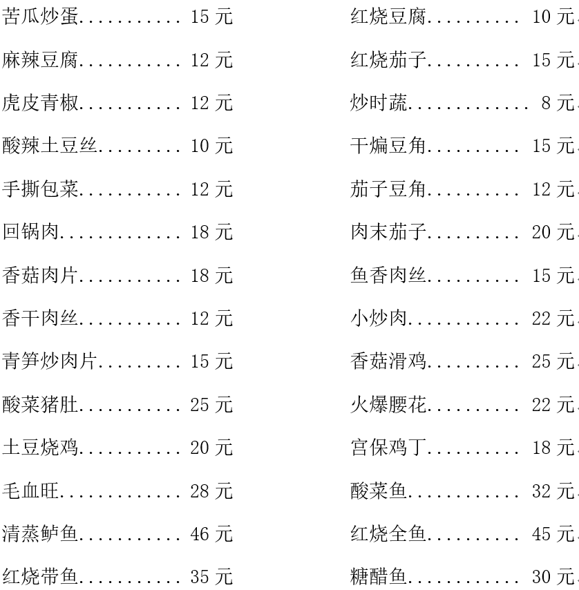 现在要对其进行制表位,首先第一个金额要右对齐,制表位位置输入16,再加上前导符,第二个菜单名称要左对齐,制表位位置输入24,第二个金额右对齐,制表位位置输入40,再加上前导符,完成如下图: