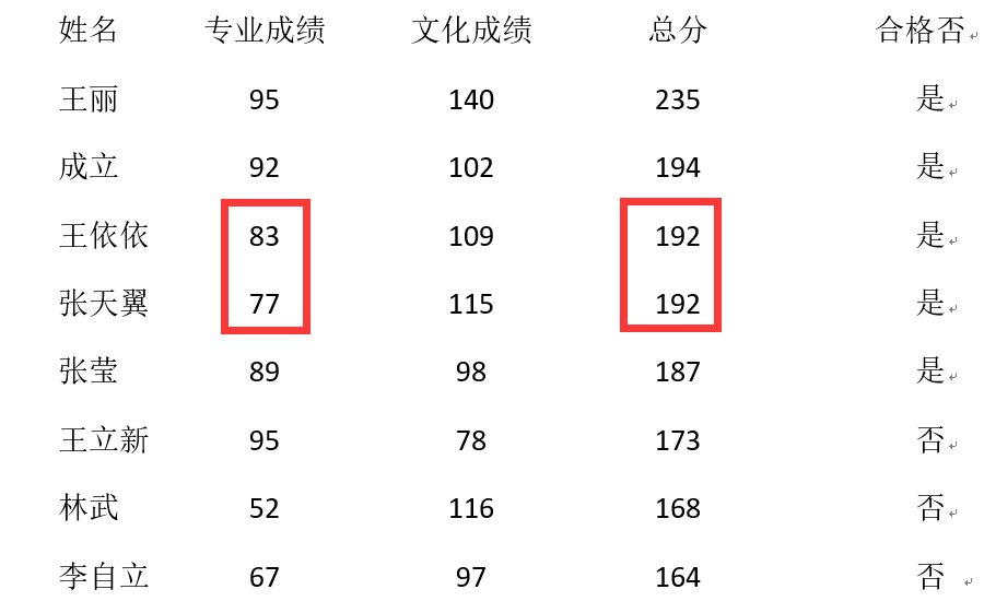 还有就是总分相同的情况下,如张天翼和王依依总分一样,专业成绩高的排名靠前,这样就需要按照主要关键字和次要关键字来排序,主要关键字还是按照总分、数字和降序,次要关键字还是按照专业成绩、数字和降序,点击确定按钮,王依依的专业成绩高,所以王依依应该排第三名,如下图: