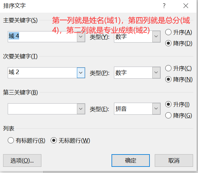 列表选择有标题行,主要关键字下拉框里出现了所有的标题,选择总分,类型跳转到数字,勾选降序,点击确定按钮,这样总分就按照降序排列成功了,如下图: