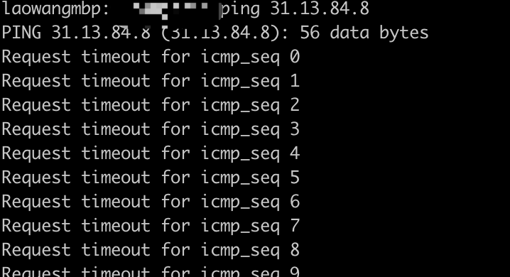 Windows用户打开cmd,Mac用户打开terminal,直接ping你的VPS IP地址,如下所示,如果返回超时(timeout)说明这个IP被封了:
