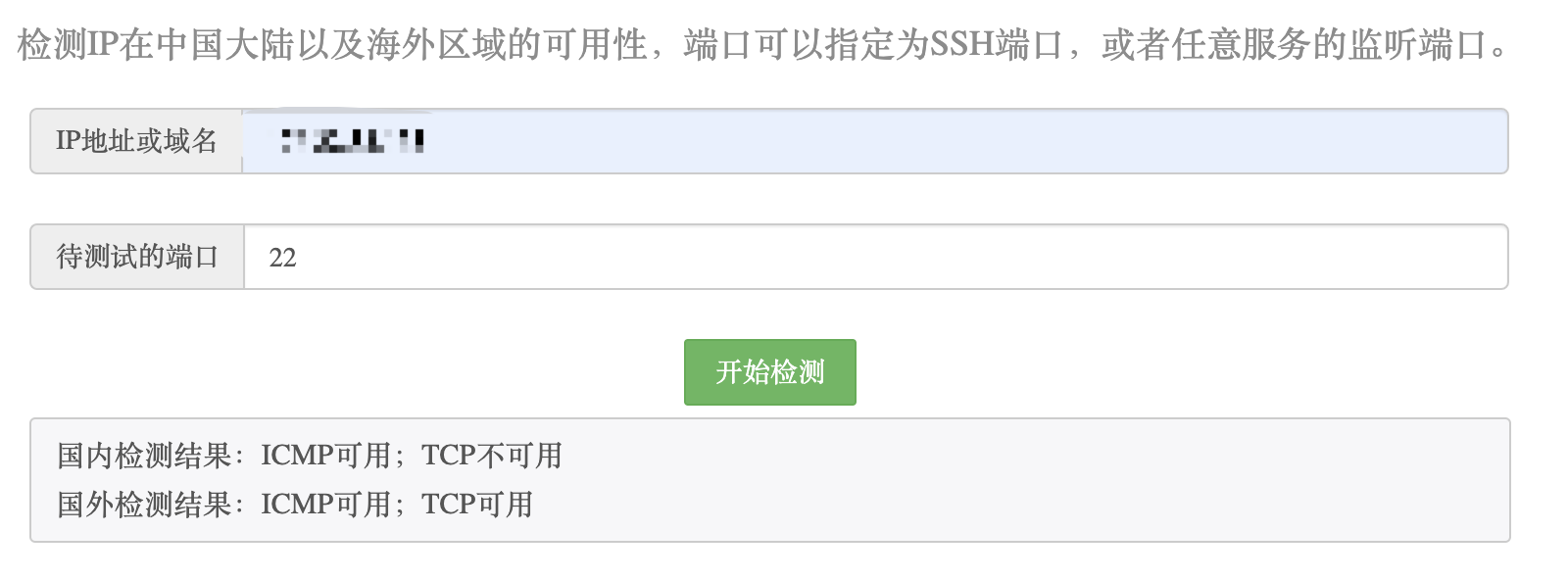 IP可用性检测工具会同时测试国内和国外的IP可用性,ICMP可用说明这个IP在该区域可以Ping通,TCP可用说明这个端口的服务可用。