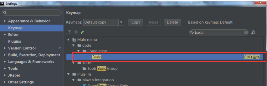 idea中默认的代码自动提示快捷键是Basic Ctrl+空格(可以再搜索框中输入basic快速查找),这个和安装的中文输入法切换快捷键冲突,所以需要修改。