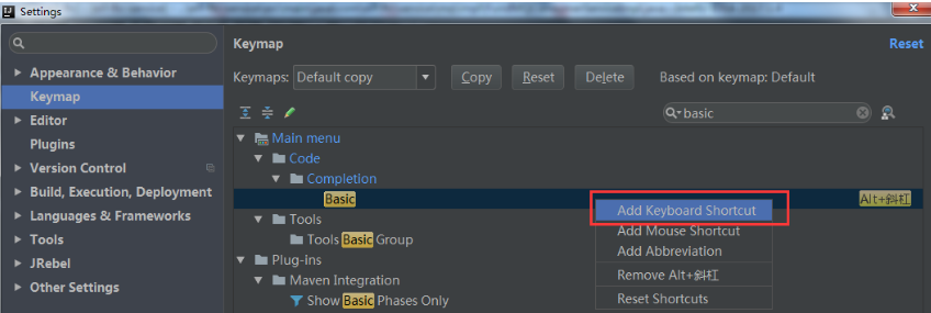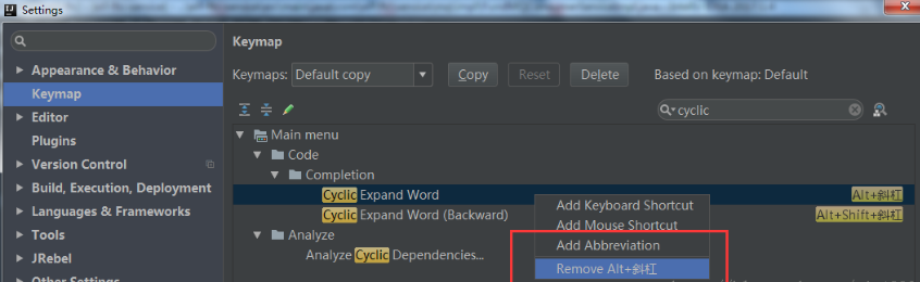 需要将Basic的快捷键修改为Alt+/,但Alt+/被Cyclic Expand Word占用,所以先修改Cyclic Expand Word的快捷键,右键Remove Alt+斜杠。