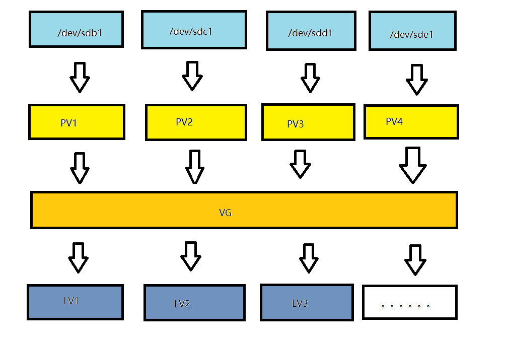 3.VG(Volume Group):卷组,建立在PV之上,可以含有一个到多个PV。
