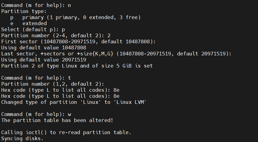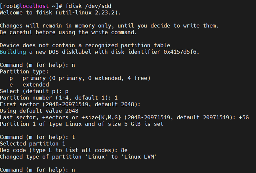 5、建好分区后,用pvcreate命令在新建的分区上创建PV