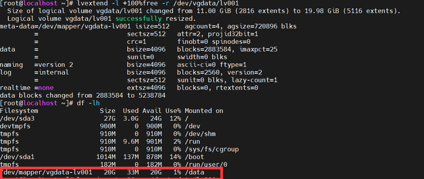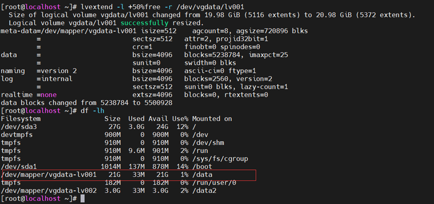 然后把50%的容量加到lv001中,会挂载在/data