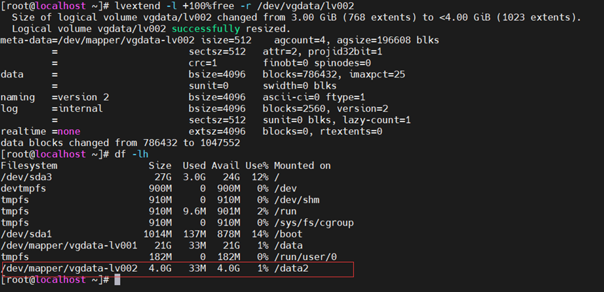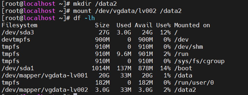 Sdd1最后剩下的都加到lv002中,就是挂载到data2中