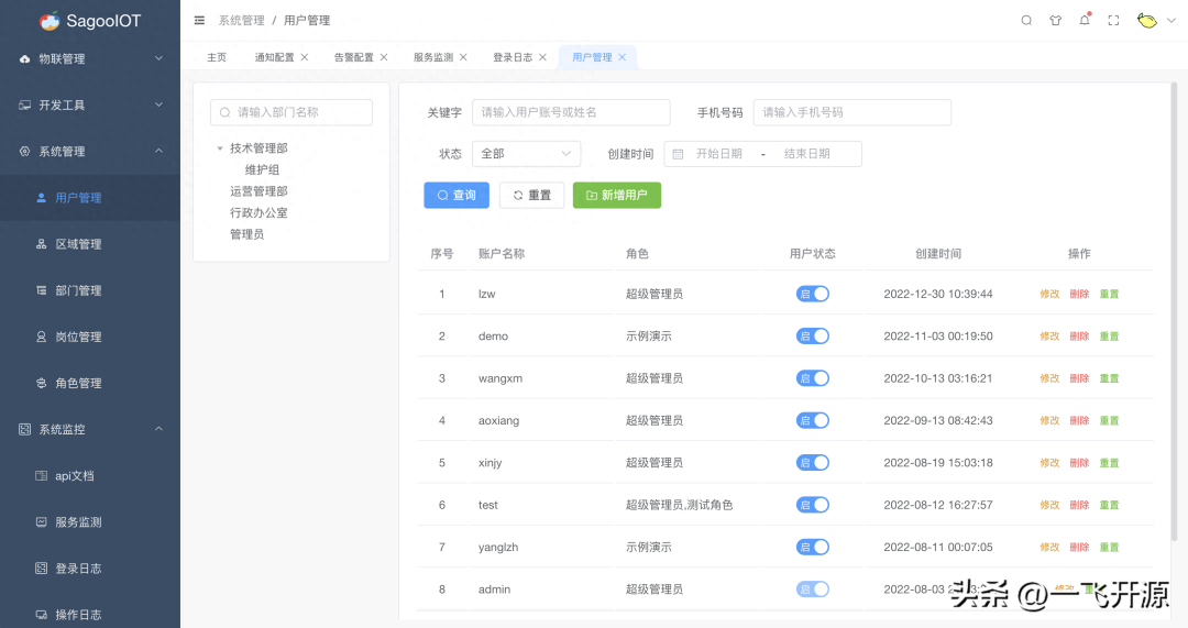 - 部门管理:配置系统组织机构(公司、部门、小组),树结构展现支持数据权限。