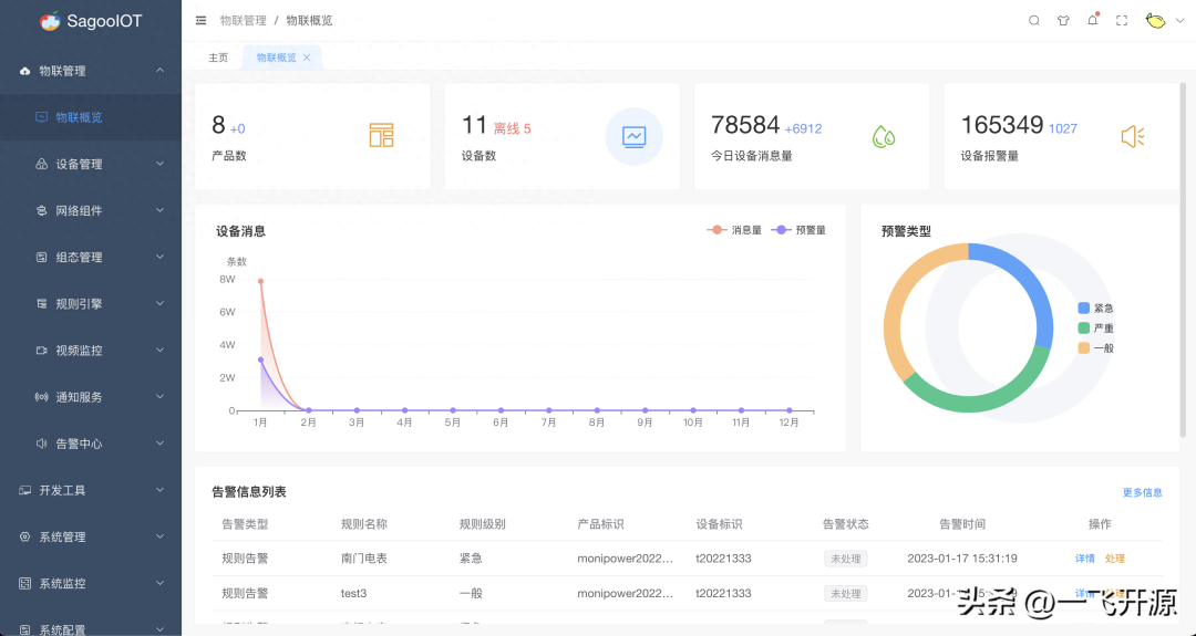 SagooIOT是一个基于golang开发的开源的企业级物联网基础开发平台。负责设备管理和协议数据管理,支持跨平台的物联网接入及管理方案,平台实现了物联网开发相关的基础功能,基于该功能可以快速的搭建起一整套的IOT相关的业务系统。旨在通过可复用的组件,减少开发工作,简化和加速物联网开发交付。适配多种接入协议(TCP,MQTT,UDP,CoAP,HTTP,GRPC,RPC等)。