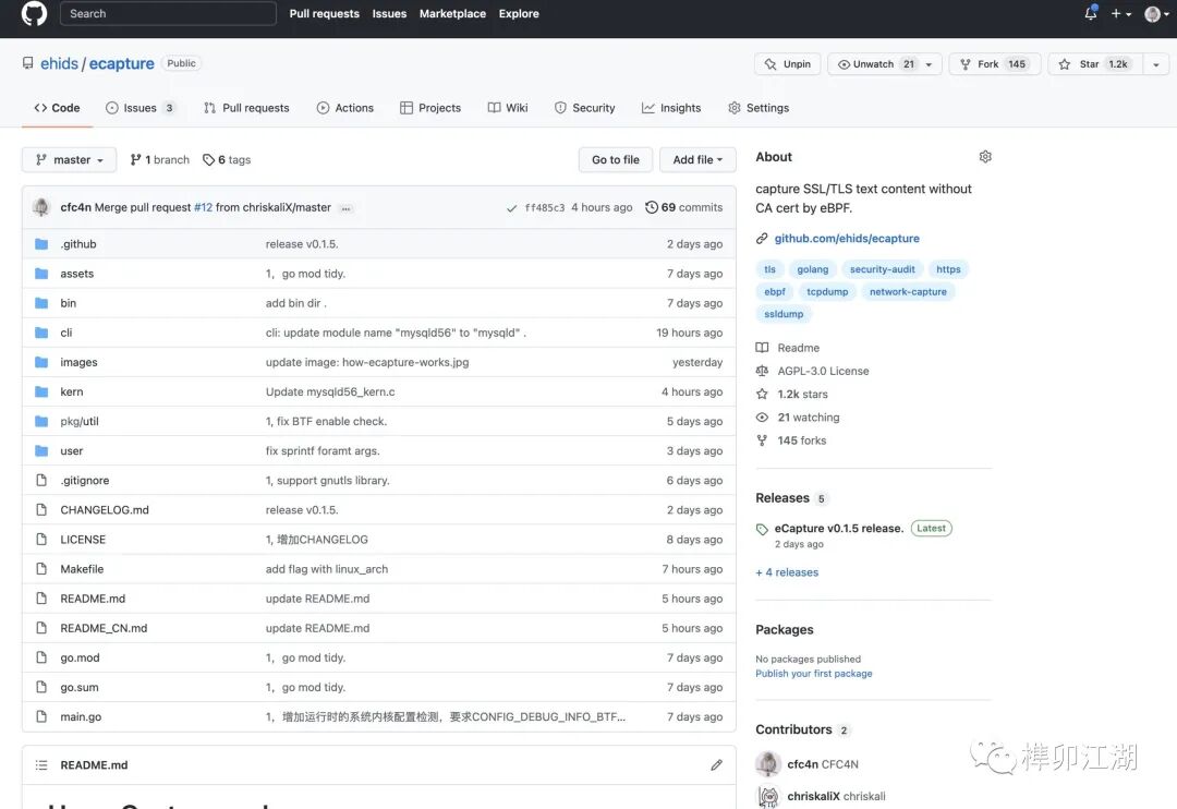 eCapture发布在https://github.com/ehids/ecapture/releases ,目前最新版为eCapture v0.1.5。