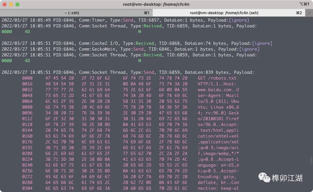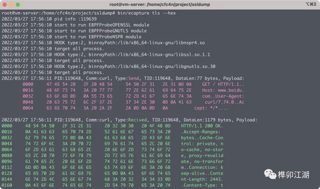 同时,使用方法也比较简单,./ecapture tls --hex命令即可。