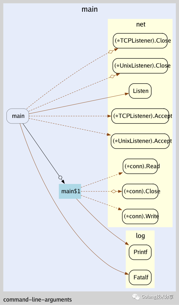 以上是一个简单的TCP服务端代码,通过 go-callvis 工具,可将其代码调用关系梳理出来。