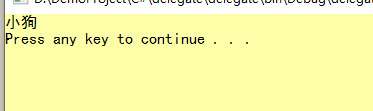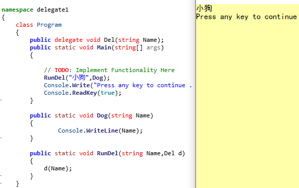 class Program { public delegate void Del(string Name); public static void Main(string[] args) { // TODO: Implement Functionality Here RunDel("小狗",Dog); Console.Write("Press any key to continue . . . "); Console.ReadKey(true); } public static void Dog(string Name) { Console.WriteLine(Name); } public static void RunDel(string Name,Del d) { d(Name); } }