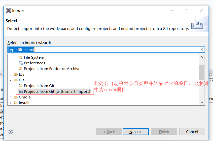 1.git 下载maven 聚合工程,这些工程没有一个统一的parent,是放在一个文件下放在git上的,通过eclipse 中git工具直接进行下载并导入到eclipse中成为maven工程,按照下图一次按照提示点next即可,注意:若是项目已经在workspase里面时不能导入成maven工程的