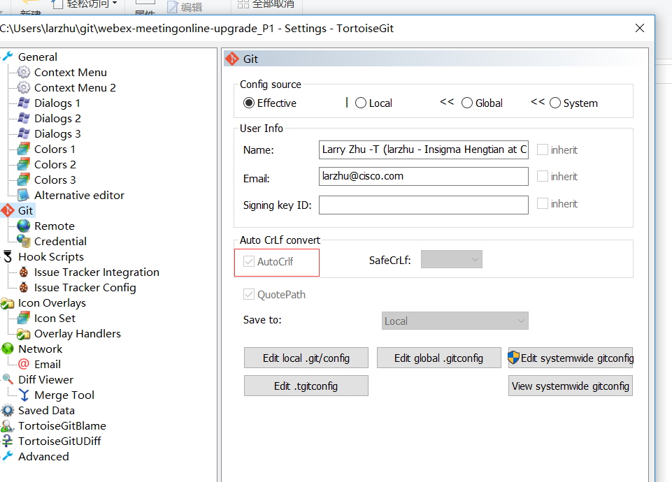 3.eclispe提交代码的时候总是遇到格式问题,导致只修改了一行代码但是怎个文件都本修改了,这个问题主要发生在多系统进行开发的环境下,有的人用unix/linux系统有的用windows系统,但是不同的系统对于“TAB”键的格式是不一样的,所有需要对git进行设置,此处具体用小乌龟git 直接设置 autocrlf 设置为ture 表示git下载及提交的时候进行自动的转换,另外eclipse中最好也进行tab键相关的设置,具体的见: https://blog.csdn.net/qq_37932863/article/details/73611785