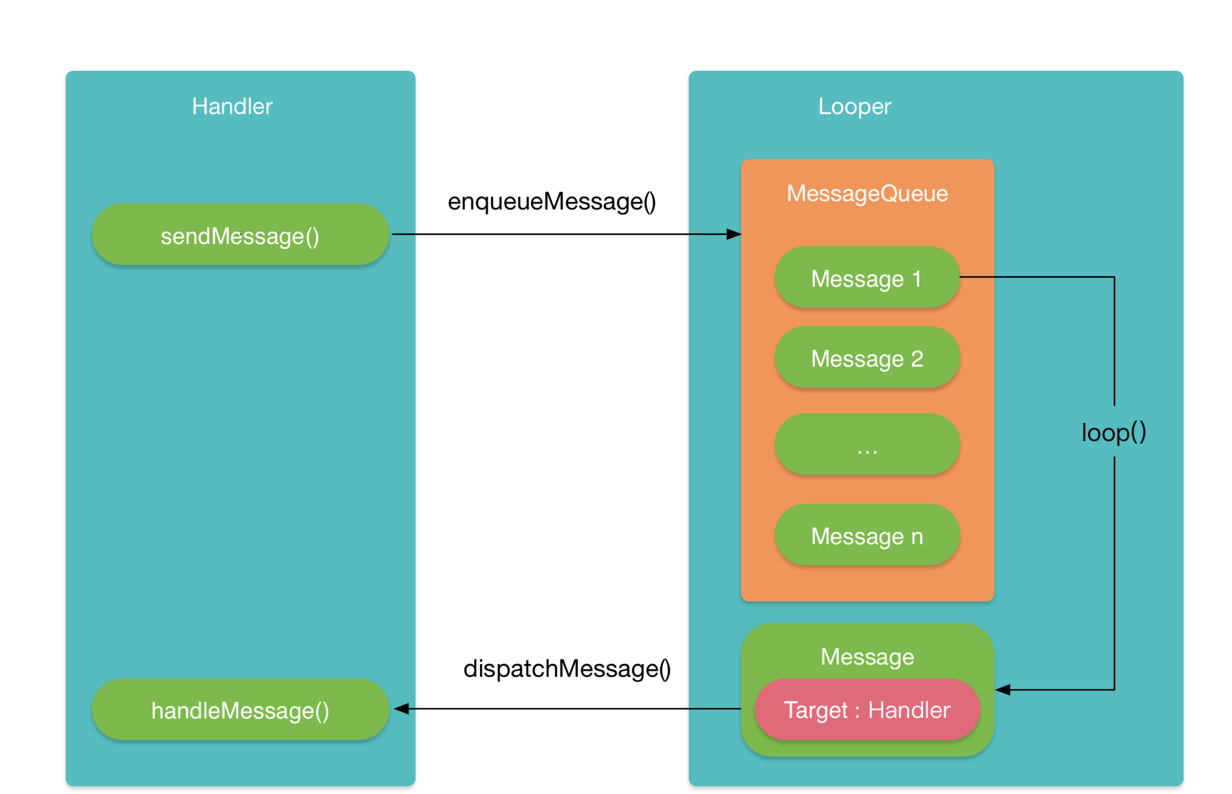 - Handler 发送的消息由 MessageQueue 存储管理,并由 Looper 负责回调消息到 handleMessage()。