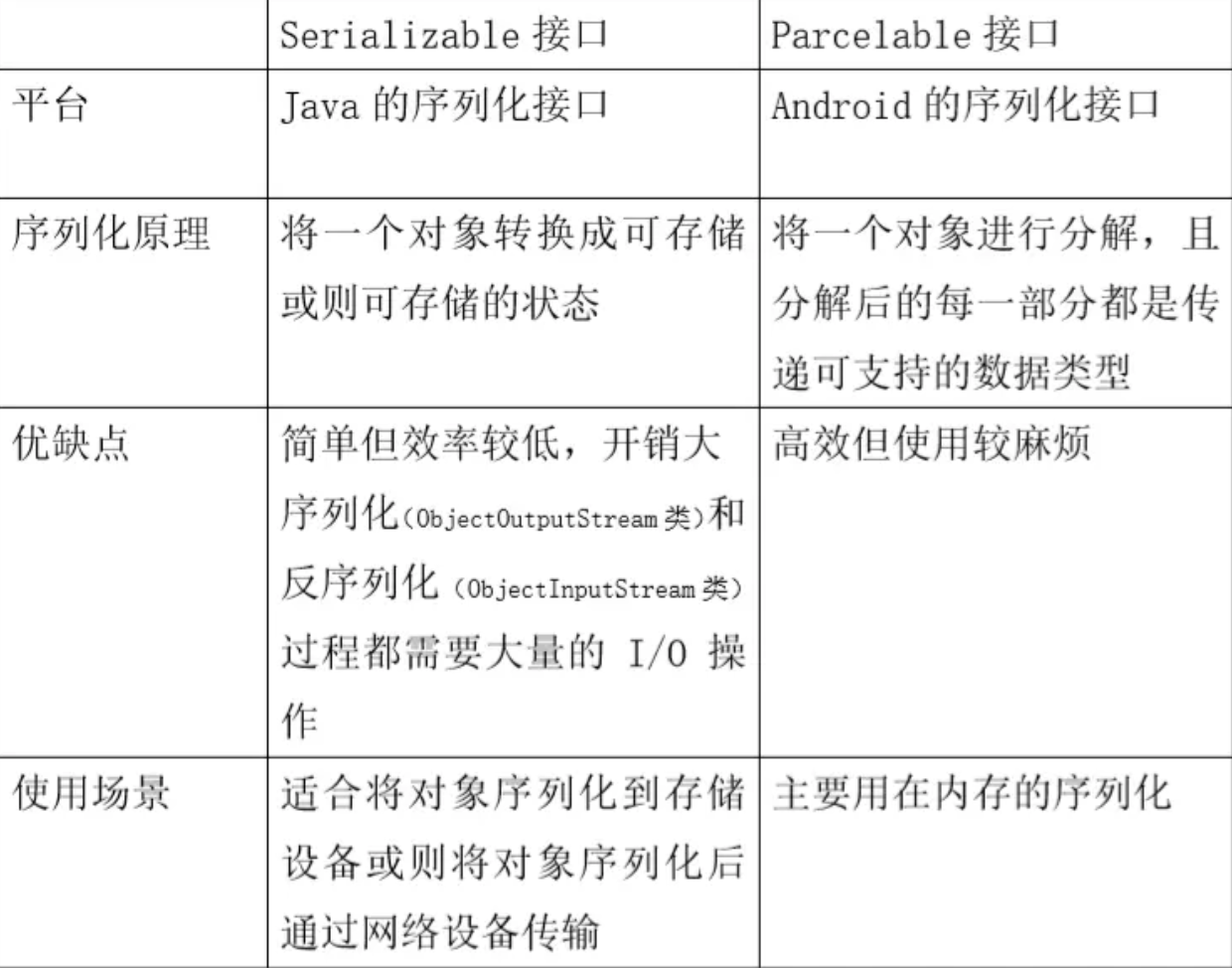 Serializable 会使用反射,序列化和反序列化过程需要大量 I/O 操作, Parcelable 自已实现封送和解封(marshalled &unmarshalled)操作不需要用反射,数据也存放在 Native 内存中,效率要快很多。