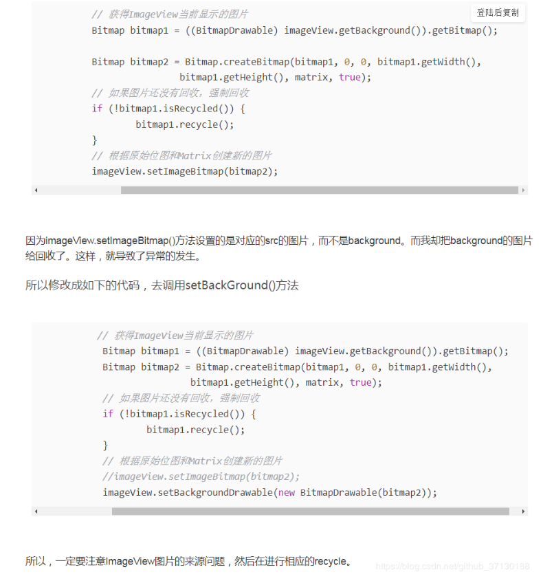 6,尽量不要使用setImageBitmap或setImageResource或BitmapFactory.decodeResource来设置一张大图,因为这些函数在完成decode后,最终都是通过java层的createBitmap来完成的,需要消耗更多内存,可以通过BitmapFactory.decodeStream方法,创建出一个bitmap,再将其设为ImageView的 source。