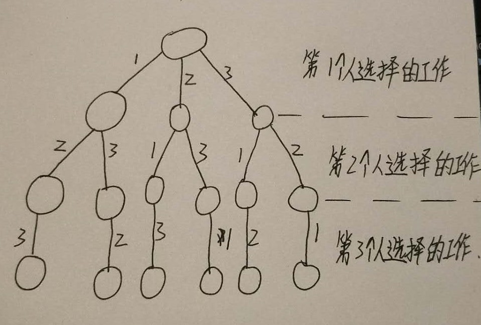 解空间:{x1,x2,x3,······,xn},其中xi=1,2,3,4···,n,表示第i个人安排的工作号。
