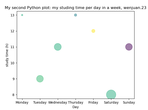 plt.title('My second Python plot: my studing time per day in a week, wenjuan.23')