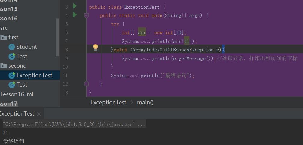 try { int a = 20; int b = 0; int result = myDiv(a, b); System.out.println(a + "/" + b + "=" + result); }catch (IllegalArgumentException e){ System.out.println(e.getMessage()); }catch (ArrayIndexOutOfBoundsException e){ System.out.println(e.getMessage()); }finally { System.out.println("程序正常结束bye bye"); } }