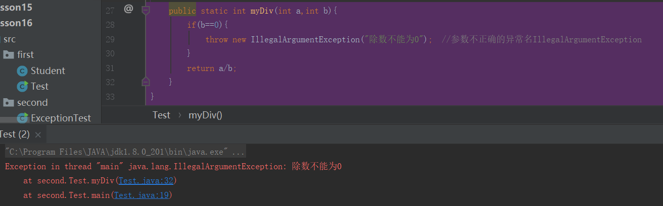 public class Test extends Student{ public static void main(String[] args) { int a = 20; int b = 0; int result=myDiv(a, b); System.out.println(a+"/"+b+"="+result); } /** * 计算a和b的除法,在函数里对除数进行处理 * @param a * @param b * @return */ public static int myDiv(int a,int b){ if(b==0){ throw new IllegalArgumentException("除数不能为0"); //参数不正确的异常名IllegalArgumentException } return a/b; } }