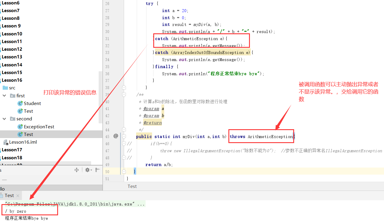 try { int a = 20; int b = 0; int result = myDiv(a, b); System.out.println(a + "/" + b + "=" + result); }catch (ArithmeticException e){ System.out.println(e.getMessage()); }catch (ArrayIndexOutOfBoundsException e){ System.out.println(e.getMessage()); }finally { System.out.println("程序正常结束bye bye"); } } /** * 计算a和b的除法,在函数里对除数进行处理 * @param a * @param b * @return */ public static int myDiv(int a,int b) throws ArithmeticException{ // if(b==0){ // throw new IllegalArgumentException("除数不能为0"); //参数不正确的异常名IllegalArgumentException // } return a/b; }