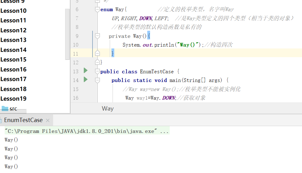 enum Way{ //定义的枚举类型,名字叫Way UP,RIGHT,DOWN,LEFT; //相当于类只定义了四个对象 } public class EnumTestCase { public static void main(String[] args){ Way way1=Way.DOWN;//获取对象 Way way2=Way.LEFT; } }