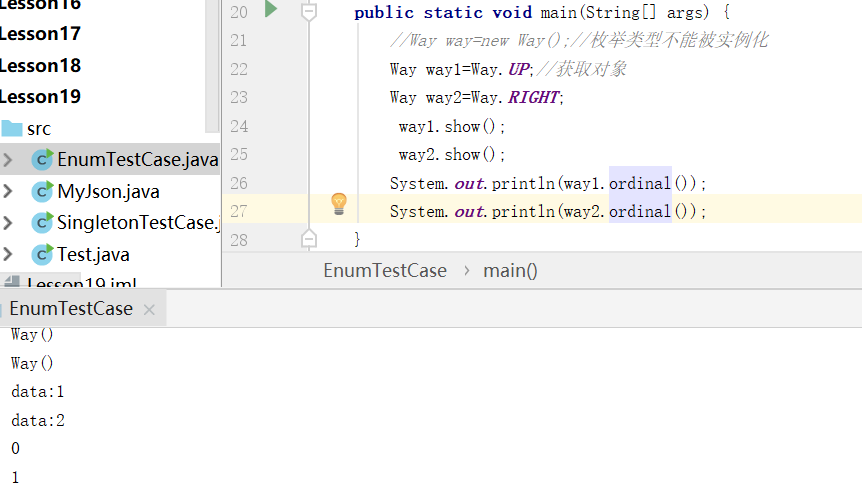 enum Way{ //定义的枚举类型,名字叫Way UP(1),RIGHT(2),DOWN(3),LEFT(4); //是Way类型定义的四个类型(相当于类的对象) private int data; //枚举类型的默认构造函数是私有的 private Way(int data){ this.data=data; System.out.println("Way()");//构造四次 } public void show(){ System.out.println("data:"+data); } } public class EnumTestCase { public static void main(String[] args) { //Way way=new Way();//枚举类型不能被实例化 Way way1=Way.UP;//获取对象 Way way2=Way.RIGHT; way1.show(); //打印对象的值 way2.show(); } }