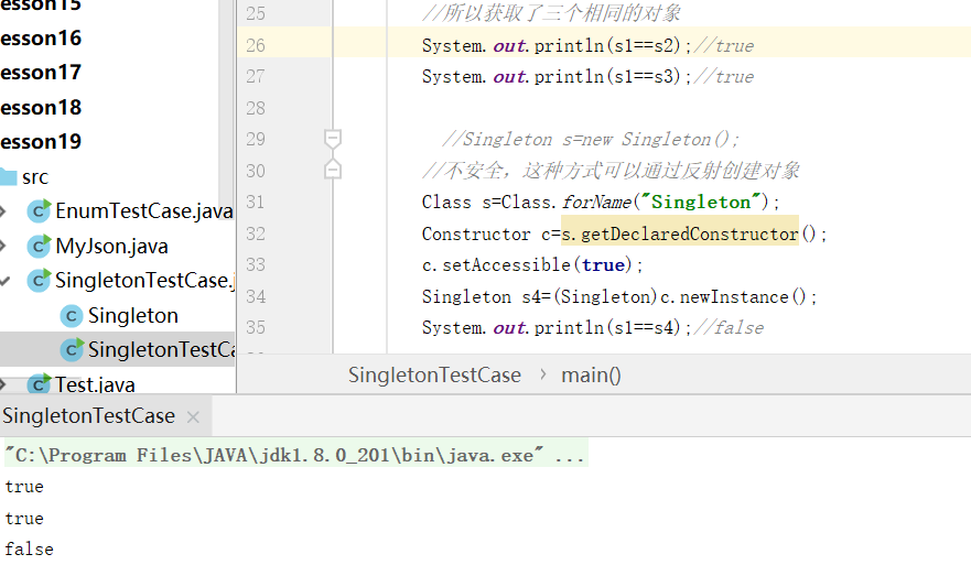 Singleton s1=Singleton.instance(); Singleton s2=Singleton.instance(); Singleton s3=Singleton.instance(); //所以获取了三个相同的对象 System.out.println(s1==s2);//true System.out.println(s1==s3);//true //Singleton s=new Singleton(); //不安全,这种方式可以通过反射创建对象 Class s=Class.forName("Singleton"); Constructor c=s.getDeclaredConstructor(); c.setAccessible(true); Singleton s4=(Singleton)c.newInstance(); System.out.println(s1==s4);//false
