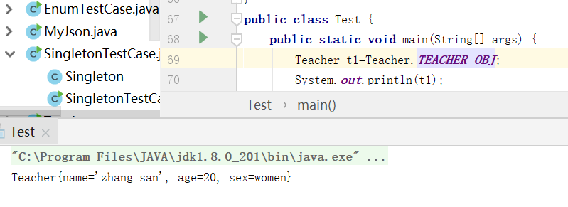 /** * 定义一个Teacher类,name age sex三个属性,设计成单例类 * 不能通过反射生成新对象 * 注意,在Constructor的enum类型进行判断,不能通过反射创建枚举类型的对象 */ enum Teacher{ TEACHER_OBJ("zhang san",20,"women");//构造函数带参数时需要在对象后传入参数属性 private String name; private int age; private String sex; } //枚举的构造默认也是private Teacher(String name,int age,String sex) { this.name = name; this.age=age; this.sex=sex; } @Override public String toString() { return "Teacher{" + "name='" + name + '\'' + ", age=" + age + ", sex=" + sex+ '}'; } } public class Test { public static void main(String[] args) { Teacher t1=Teacher.TEACHER_OBJ; System.out.println(t1); } }