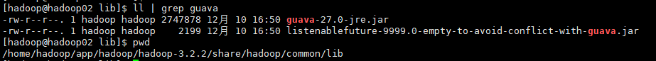 出现原因:hadoop和hive 对应的guava文件版本不一致,hadoop guava文件在hadoop安装目录share/hadoop/common/lib路径下;hive此文件在hive解压目录lib目录下,如图二,两个路径下均保持高版本文件即可