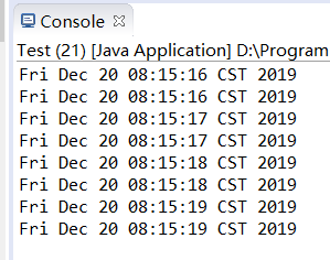 1 package 多线程作业; 2 3 import java.util.Date; 4 5 public class TimeShow extends Thread { 6 7 public void run() { 8 super.run(); 9 Date date; 10 while(true){ 11 date = new Date(); 12 System.out.println(date); 13 try { 14 date = new Date(); 15 System.out.println(date); 16 Thread.sleep(1000); 17 } catch (InterruptedException e) { 18 e.printStackTrace(); 19 } 20 } 21 22 23 24 } 25 26 27 28 }