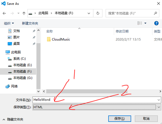点击file,new file,创建一个文件,默认名字为Untitled-1,按Ctrl+S保存,把名字设为HelloWord,文件类型选择HTML后保存。我个人喜欢保存在F盘。