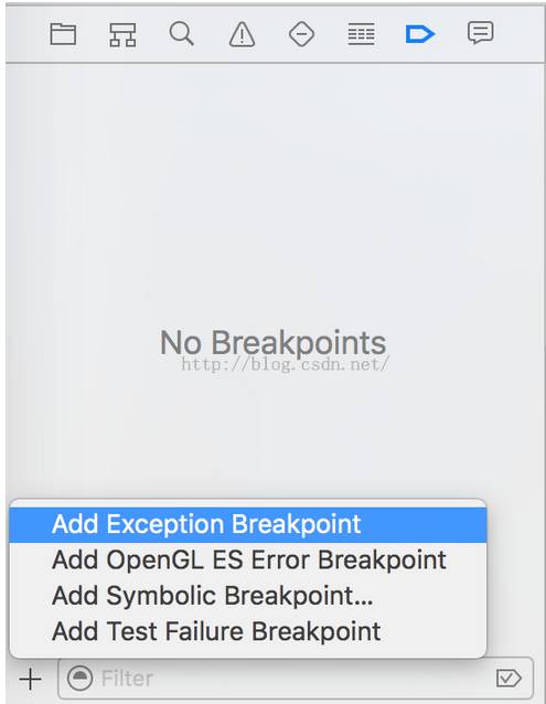 断点的功能不限于上面所述。开发iOS知道,如果我们因为异常然后程序crash了,代码就直接跑到main.m的main函数中去了。为什么就不能跑到出现异常的代码中呢???异常断点就为我们解决该问题,程序就会在异常出现的那行代码终止。创建异常断点图例如下: