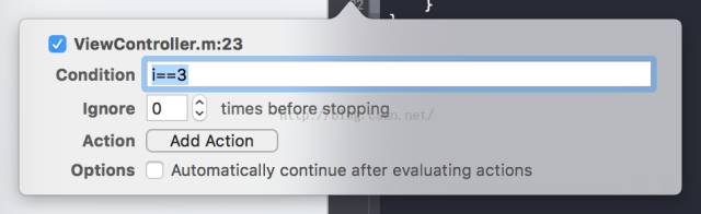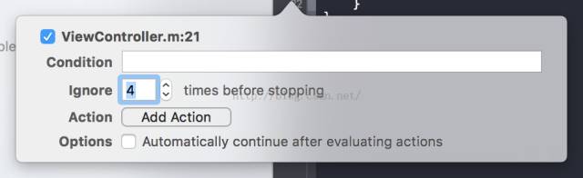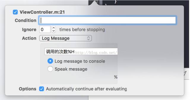 同时,还可以查看某个函数被调用的次数,设置Action参数如下,注意要选中Automatically continue after evaluating actions.