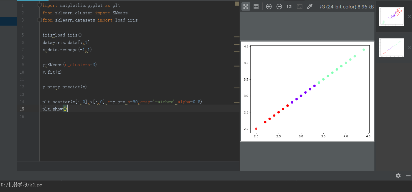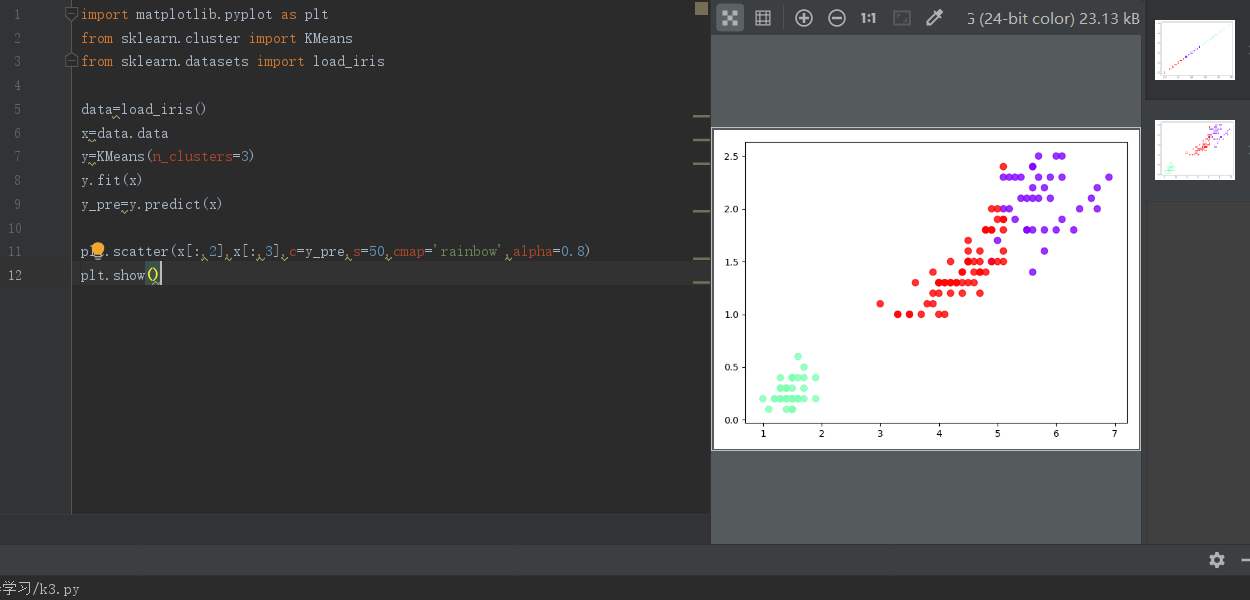 2). *自主编写K-means算法 ,以鸢尾花花瓣长度数据做聚类,并用散点图显示。(加分题)