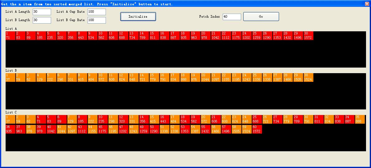 这里是算法演示动画程序,大家可以在这个程序里设置两个数列的长度(List A/B Length)和数据随机增长率(List A/B Gap Rate),然后设定要选择第几项(Fetch Index),然后就可以观看算法动画。