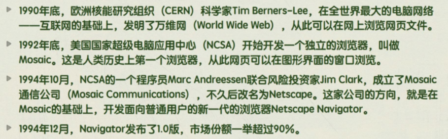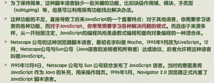 "1994年,网景公司(Netscape)发布了Navigator浏览器0.9版。这是历史上第一个比较成熟的网络浏览器,轰动一时。但是,这个版本的浏览器只能用来浏览,不具备与访问者互动的能力。......网景公司急需一种网页脚本语言,使得浏览器可以与网页互动。"