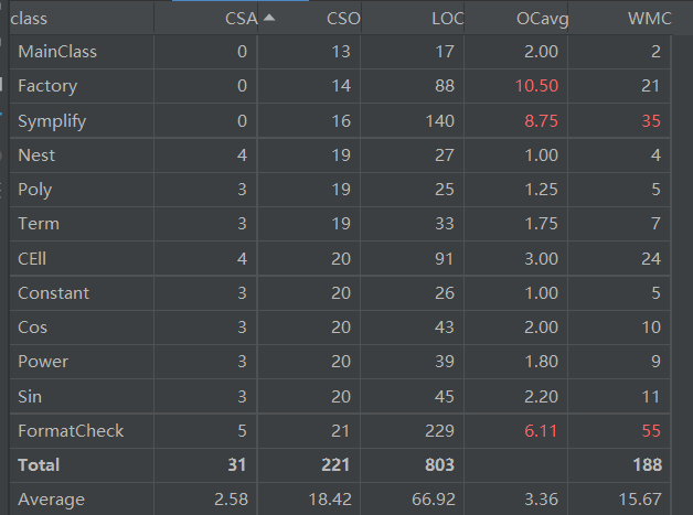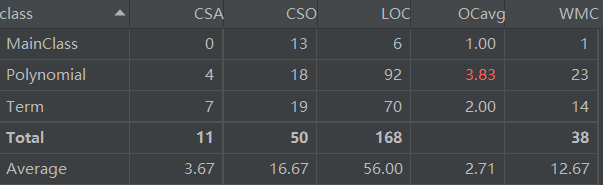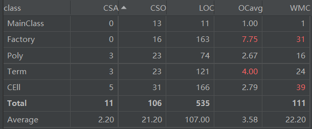 - 类的属性个数(CSA),方法个数(见类图),平均方法规模(OCavg),类的总代码规模(LOC),带权方法复杂度(WMC)